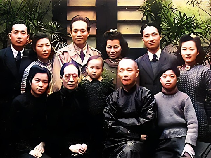 1945年12月12日,何遂家的全家福。何遂在照片後題字:“民國三十四年九月二日,日寇簽降。雙十二全家聚於渝,攝影留念。抗戰八年,家人無恙,長次三男均成家, 長孫申佳已三歲,殊可喜也。”照片前排左起:女兒何嘉,妻子陳坤立,二子的大兒子何孟嘉,何遂,四子何達;後排左起:二子何世平,二兒媳韓蘊,長子何世庸(11歲起在加拿大讀中學,後來歸國讀大學,在沈陽學醫,他是何遂四個中共地下黨員子女裏第一個入黨的),長兒媳李智勤,三子何康,三兒媳繆希霞(繆希霞是廣西大學校花,比何康年長三歲半,本來何遂夫婦想禮聘為長媳,沒想到大小姐愛情至上,與同在廣西大學讀書,近水樓台的“三弟”何康相愛了)